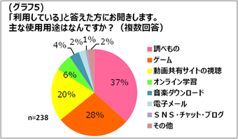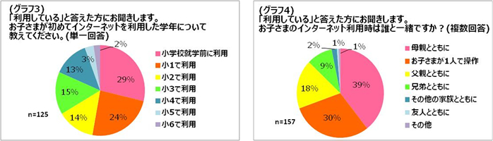 インターネット利用時の利用頻度においては、「週に数回」(29%)、「月に数回」(27%)、「まったく使わない」(20%)、インターネット利用者の中で使用している端末は「自宅のパソコン」(55%)、「親のスマートフォン」(21%)、「自宅のタブレット端末」(14%)が上位を占めました。また、初めてお子さまがインターネットに接続した学年では、「小学校就学前」(29%)が一番高く、利用時は「母親とともに」(39%)に次いで「お子さまが1人で操作」(30%)という結果になりました。使用用途は「調べもの」(37%)、「ゲーム」(28%)、「動画共有サイトの視聴」(20%)が上位を占めました。