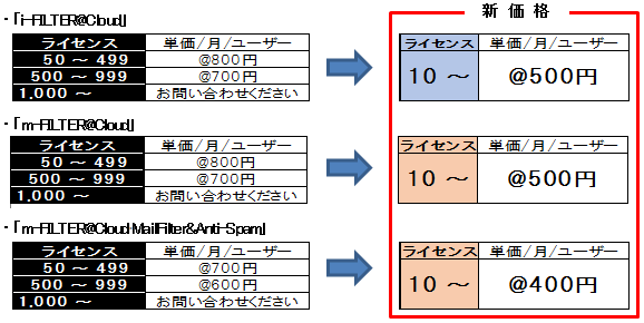 - ※ 「m-FILTER@Cloud」および「m-FILTER@Cloud MailFilter & Anti-Spam」の100ユーザー未満でのご購入は新規・既存のお客様いずれも、2020年3月16日から適用となります。