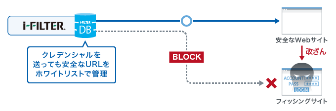 デジタルアーツ独自の技術で、正規のサイトと判別が困難な改ざんサイトへ、ユーザーがID・パスワードを送信しようとしても、これをブロックすることで、ネットワークの侵入経路の入口を確実に遮断します。