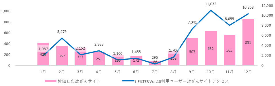 弊社Webセキュリティ製品「i-FILTER」 Ver.10をご利用中のお客様が、改ざんサイトへのアクセスを試みた回数は、2019年全体で53,894回(12月のみで10,358回)を観測しました。