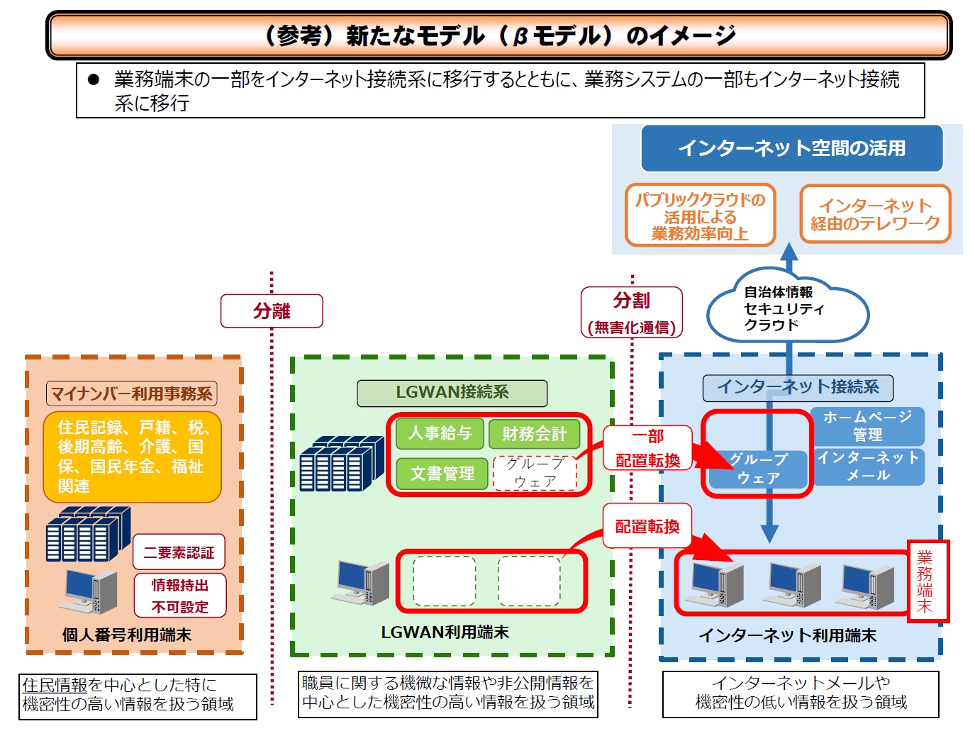 これまで完全に分離されていた各ネットワーク環境を、情報セキュリティ対策を実施した上で、インターネット接続系に業務端末を配置した新たなモデルを「βモデル」として示し、自治体内部環境からパブリッククラウドへの接続、自治体内部環境へのリモートアクセスを可能としています。セキュリティを維持しつつも自治体業務の効率化するネットワーク環境となります。