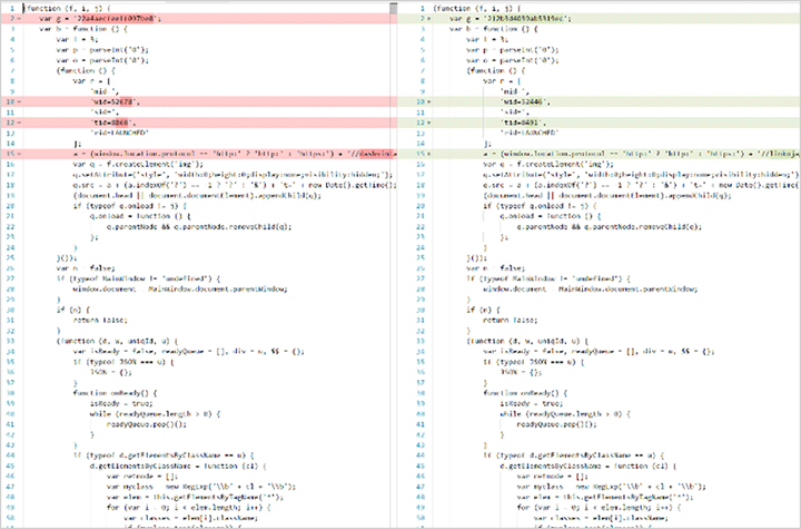 左がA社Webサイトで使われたJavaScriptファイル、